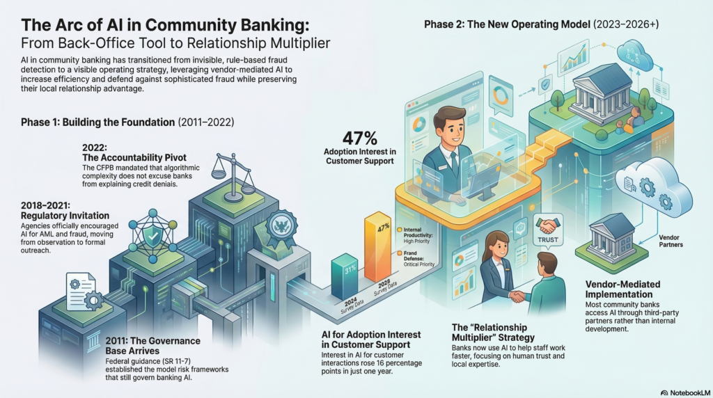It covers the full history of AI in community banking, 40 confirmed deployed use cases, 15+ named case studies with verified results, a complete vendor reference matrix, regulatory guidance through early 2026, and a 90-day action plan broken down by role. Whether you’re bringing it to your next board meeting or using it to build your AI roadmap, it’s all in one place.